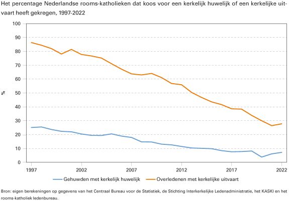 Ook bij deze katholieke rituelen zijn duidelijke veranderingen zichtbaar. Tussen 1997 en 2022 daalde het aandeel katholieken dat ook in de kerk trouwde bijvoorbeeld van 25 procent naar zeven procent (zie figuur). Jongvolwassenen, die veruit het meest trouwen, zijn dus niet alleen minder vaak katholiek. Katholieke jongvolwassen zijn ook minder betrokken. Dit is ook terug te zien in andere cijfers: van alle 25- tot 35-jarige katholieken in 2012 noemde een op de drie zich tien jaar later niet langer katholiek. Een groot gedeelte van deze jongvolwassenen schreef zich ook echt uit.